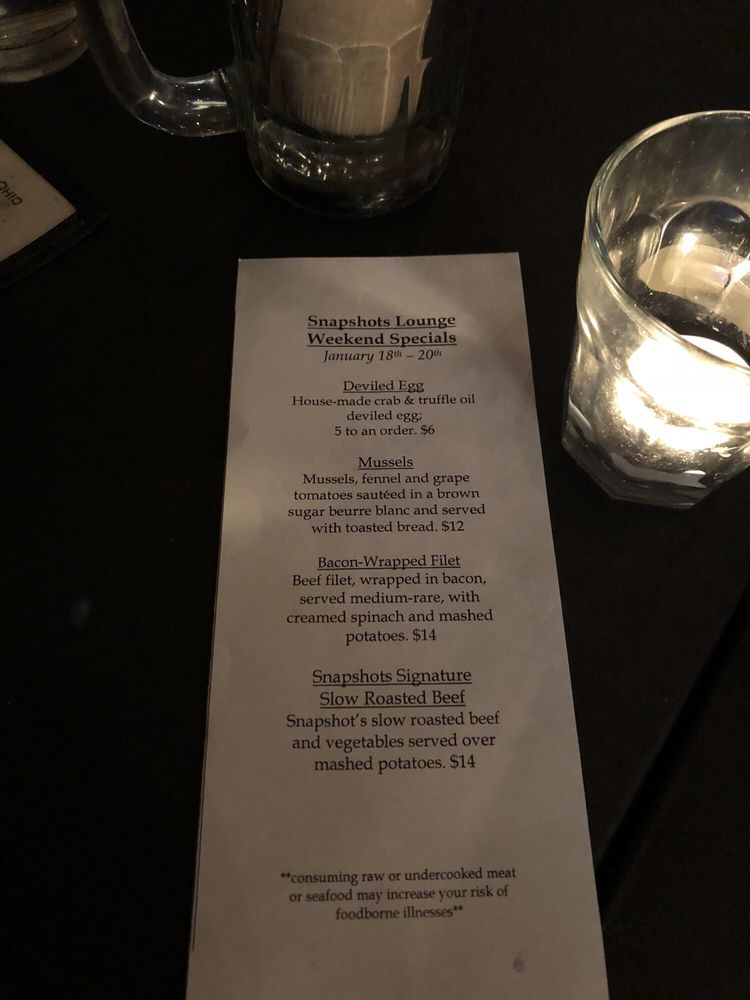 Snapshots Lounge, located in Granville, OH, offers a delightful mix of soul food, sandwiches, and diner classics. With a range of vegetarian options and a casual yet trendy atmosphere, Snapshots Lounge is perfect for groups, families, and even date nights. The menu is filled with creative and delicious specials, from lobster rolls to the famous Frenchie sandwich. Customers rave about the excellent service and tasty dishes, like the Cuban Pork sandwich and the flavorful Clam Chowder. With options for takeout, reservations, and catering, Snapshots Lounge aims to please all kinds of diners. Whether you're craving a hearty sandwich or a light soup, Snapshots Lounge promises a satisfying meal with a cozy ambiance. Don't miss out on this hidden gem in Granville!